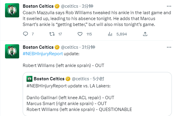 凯尔特人球员罗伯特-威廉姆斯(左脚踝扭伤)、斯玛特(右脚踝扭伤)和加里纳利都因伤无法出战,绿军主帅马祖拉表示罗威上一场扭伤脚踝并且脚踝肿了,因此缺席今天的比赛;斯玛特的脚踝伤势好转,但还无法参加比赛。