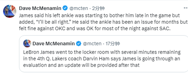 换言之,詹姆斯因伤提前离场是疲劳导致的,大战国王苦战36分钟,若没有提前退场,他可能带伤出战40分钟;本赛季至今,詹姆斯因左脚踝腓侧肌腱炎一直都在湖人伤病名单上,到了常规赛的最后阶段,詹姆斯的伤势俨然成为湖人冲击季后赛的最大隐患。