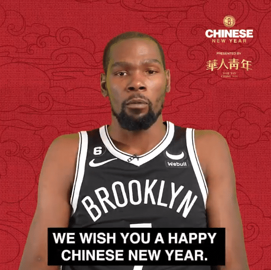 篮网官方发推祝贺球迷们兔年大吉大利,还晒出杜兰特、欧文领衔众人向中国球迷拜年,杜兰特表示:我是篮网队杜兰特,祝中国球迷兔年快乐;其中欧文和西蒙斯都用汉语祝大家新年快乐。