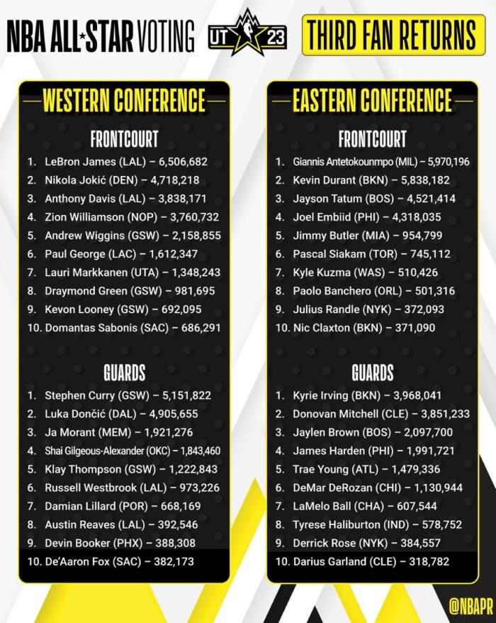东部前场:1、字母哥5970196票;2、杜兰特5838182票;3、塔图姆4521414票;4、恩比德4318035票;5、巴特勒954799票;6、西亚卡姆745112票;7、库兹马510426票;8、班凯罗501316票;9、兰德尔372093票;10、克拉克斯顿371090票