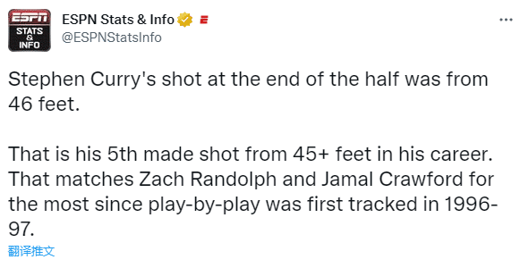 2、库里生涯第5次命中45英尺以上的超远三分,追平扎克-兰多夫和克劳福德并列历史最多(Play-by-play时代,自1996-97赛季开始算起)