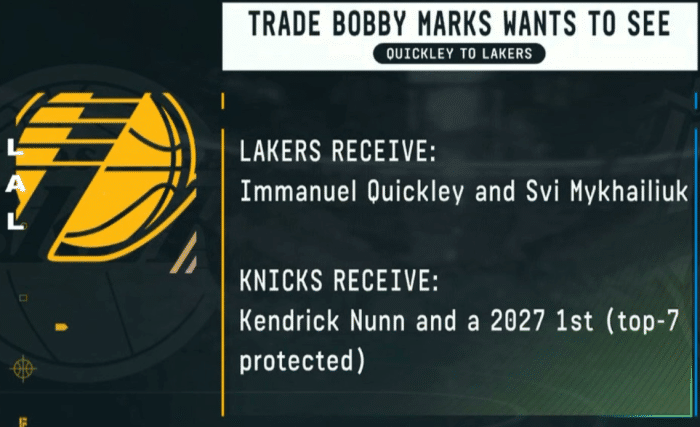 第二种交易方案:湖人把纳恩和2027年受保护首轮签(前7受保护)送到尼克斯,换来奎克利和米哈伊柳克。