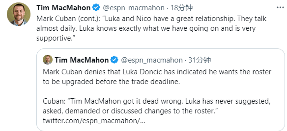 独行侠老板库班第一时间站出来辟谣,表示:Tim MacMahon完全错了,卢卡从未建议、要求或者讨论过改变阵容的大名单。