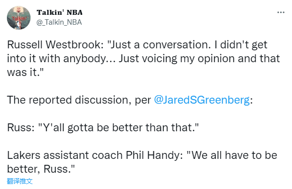 来源:JRS直播网01-18 10:54JRS直播网01月18日讯 上一场湖人主场击败火箭从而终结三连败,不过期间威少和湖人助教争执一幕引热议,当时詹姆斯安抚两人,对此威少本人回应不是吵架,菲尔-汉迪也发声了。