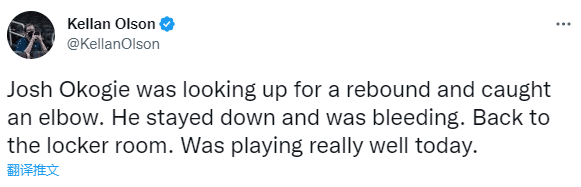 来源:JRS直播网01-17 12:21JRS直播网01月17日讯 ,在太阳和灰熊比赛中,太阳又伤一员大将,奥科吉遭艾顿误伤,被肘击到鼻子,倒地不起血染赛场,最终太阳宣布奥科吉因鼻子受伤退出本场比赛。