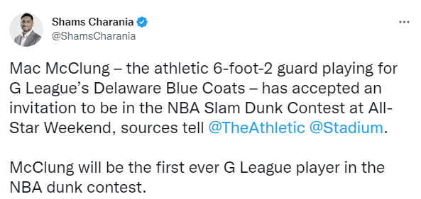 来源:JRS直播网01-14 15:43JRS直播网01月14日讯 ,据名记shams报道,湖人旧将马克-麦克朗已经接受参加NBA扣篮大赛,麦克朗承诺参加扣篮大赛创造历史,成为史上第一位参加扣篮大赛的发展联盟球员;目前扣篮大赛4人名单已确定三席,另外两位参赛者是开拓者新秀夏普和火箭名宿之子小马丁。