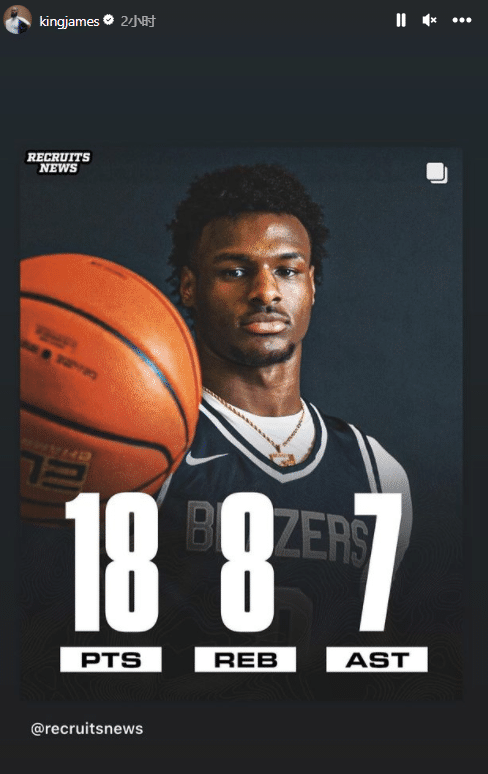 詹姆斯在Ins上转发出席布朗尼高中毕业日的现场画面,还晒出布朗尼的数据。