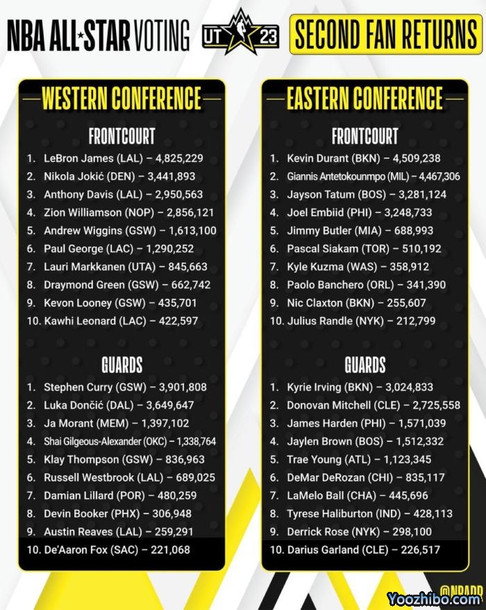 东部前场:杜兰特4509238票、字母哥4467306票、塔图姆3281124票、恩比德3248733票、巴特勒688993票、西亚卡姆510192票、班凯罗341390票、克拉克斯顿255607票和兰德尔212799票