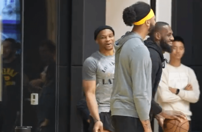 湖人全队训练之后,詹姆斯穿着拖鞋和威少比试底角三分,视频中,詹威轮番出手,詹姆斯前2次三分都命中,威少第二投打铁,老詹第三投打铁,威少则命中第三球,然后老詹再次命中三分;浓眉现身训练场,戴着黄色发带并且换了新发型,把头发绑起来了,与詹威开心互动,新发型十分抢镜。
