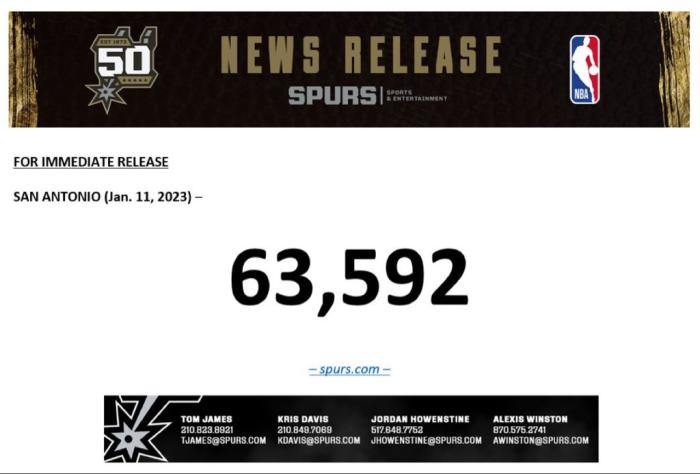 来源:JRS直播网01-12 10:23JRS直播网01月12日讯 ,本赛季马刺战绩糟糕,但马刺已经打破一项NBA历史第一纪录,据报道,马刺迎着勇士的门票已经售出63592张,打破NBA历史上座纪录。