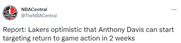 美媒NBA Central表示湖人乐观认为浓眉可以在2周内重返赛场。