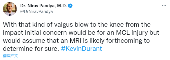 杜兰特伤势如何?医学专家Nirav Pandya表示由于撞击造成膝盖外翻,最初担心的是MCL(膝盖内侧副韧带) 损伤,MRI核磁共振将确定伤情。