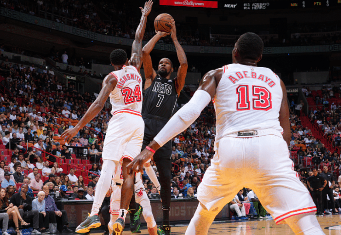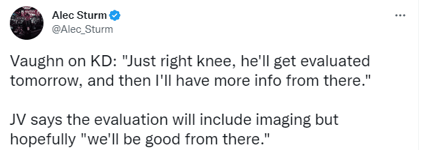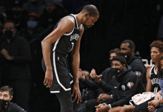 第三节,巴特勒持球突破赛斯-库里,跳步杀到禁区,上篮时被西蒙斯大帽,巴特勒身体失去平衡并且摔倒,杜兰特不幸遭殃,被巴特勒压伤膝盖;杜兰特穿上鞋子坚持一会后主动要求下场,并且返回更衣室接受检查,最终篮网官方宣布杜兰特因右膝受伤,本场比赛不会回归。