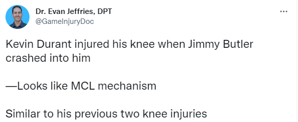 另一医学专家Evan Jeffries也担忧杜兰特遭遇膝盖内侧副韧带损伤的伤病。