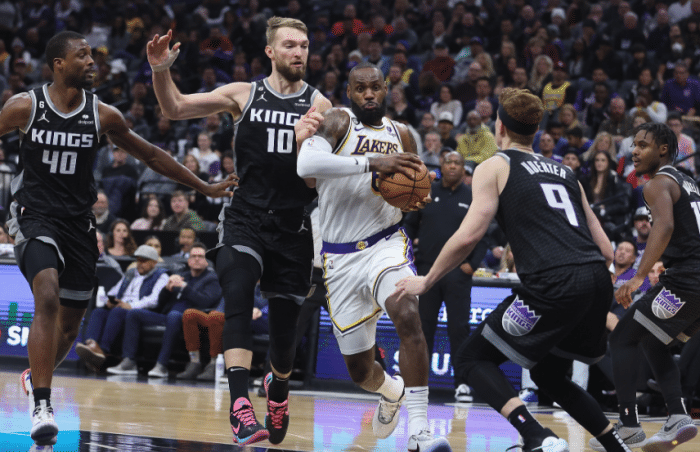 末节,詹姆斯继续持球强杀,摔倒后众队友赶紧来扶;老詹带领湖人13-4领先到9分,6分57秒詹姆斯下场休息,湖人被国王打出9-2攻势,领先优势仅剩2分,下场仅歇1分多钟老詹就重新回来,詹姆斯和托布助湖人保持微弱领先,福克斯抛投追平比赛,生死时刻,詹姆斯中投打铁以及推倒默里致命失误,之后老詹强突打成关键2+1,施罗德防守立功,威少两罚一中,福克斯扳平比分,最后6.8秒,施罗德罚球准绝杀,湖人惊险拿下比赛。