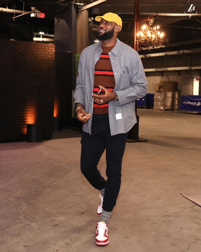 今天湖人主场对阵老鹰,38岁詹姆斯身穿衬衫、黑色长裤和红白配色的运动鞋,戴着一顶黄色棒球帽,听着音乐且手里拿着手机,面带笑容,提前4小时抵达球馆。