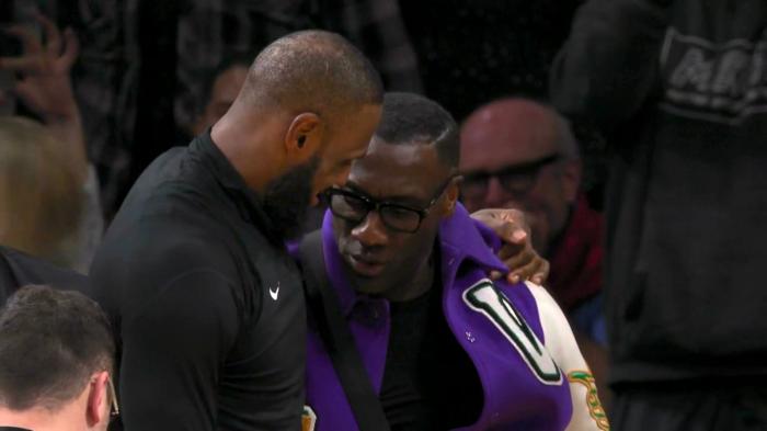 湖人锁定胜局后,比赛还剩16秒,詹姆斯站在场边为队友鼓掌庆祝,赛后詹姆斯开心地跑向球场另一头,拥抱名嘴香农-夏普。