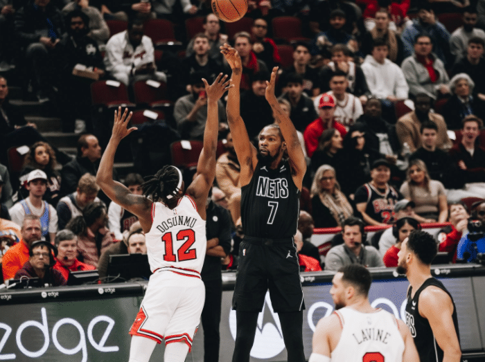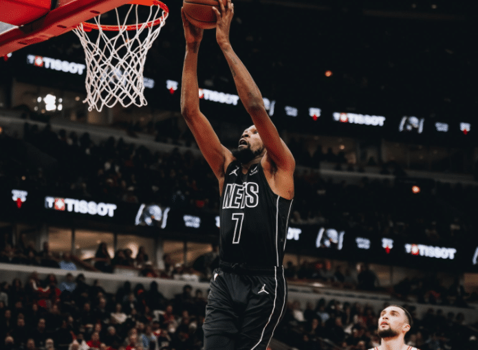 末节,篮网又被公牛拉开分差,杜兰特上场后输送火力,德罗赞连中关键球,赛斯-库里连续命中三分,欧文反击上篮,公牛疯狂包夹杜兰特,KD难以出手,最终篮网客场输球,12连胜惨遭公牛终结。