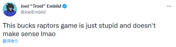 对于猛龙最后36秒11-0扳平比分拖进加时,76人球星恩比德发推写道:雄鹿和猛龙这比赛有点离谱啊,说不过去啊,笑死了。