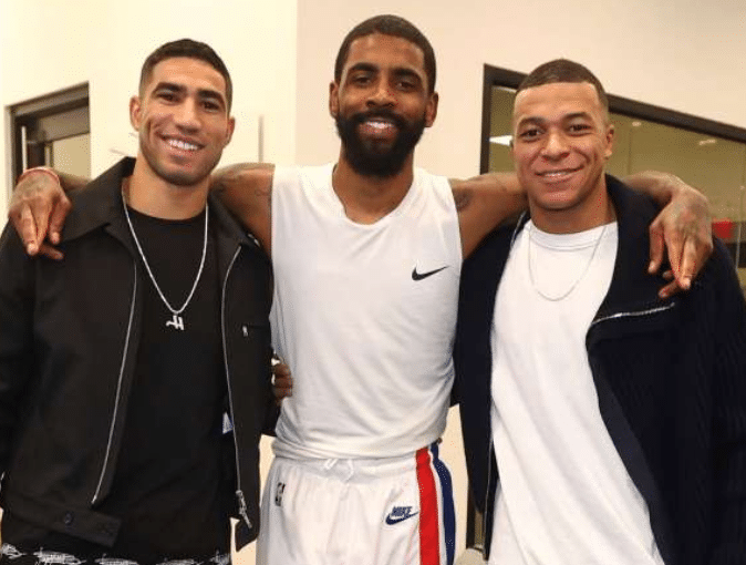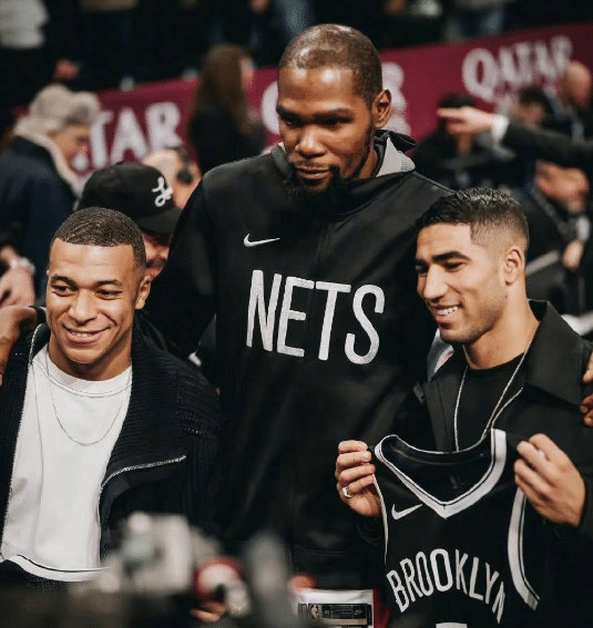 在篮网大胜马刺的比赛中,大巴黎球星姆巴佩和阿什拉夫来到现场观战,赛后杜兰特与他们合影,并且把原味签名球衣送给阿什拉夫。
