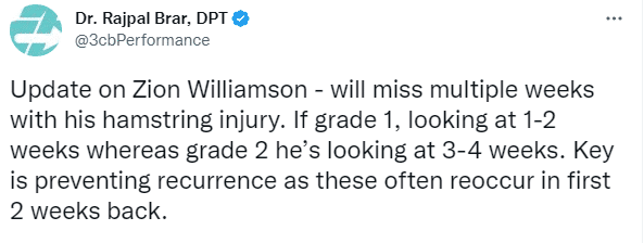对于锡安的伤情,医学专家Rajpal Brar表示锡安因腿筋伤势将会缺席数周,若是一级拉伤,需要休养1-2周,若是二级拉伤,需要休养3-4周,关键是防止伤势复发,这种症状通常会在前2周复出。