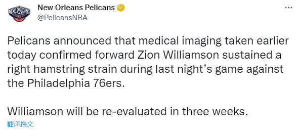 本场比赛,锡安打了28分钟,12投10中拿到26分7助攻6篮板,无奈又伤了,因伤提前退赛;经过核磁共振检查,锡安的伤情确诊为右腿筋拉伤,至少伤停3周。
