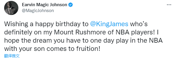 湖人名宿魔术师祝贺詹姆斯:祝詹姆斯生日快乐,你绝对在我的NBA球员总统山上!我希望你和儿子一起在NBA打球的梦想能够实现!