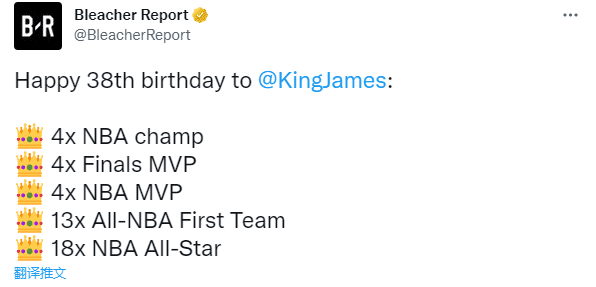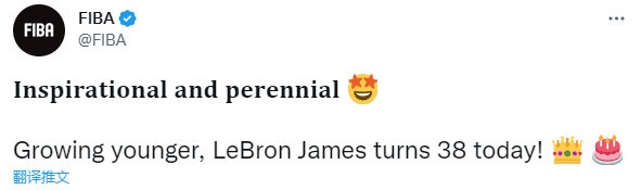 NBA官方、湖人官方以及FIBA官方都祝贺詹姆斯38岁生日快乐,其中FIBA晒詹姆斯漫画照,配文写道:鼓舞人心,篮坛常青树,越来越年轻,勒布朗-詹姆斯今天38岁啦。