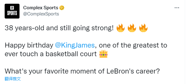 美媒Complex Sports发推:38岁依旧坚强,生日快乐,有史以来最伟大的球员之一。