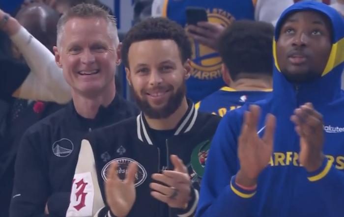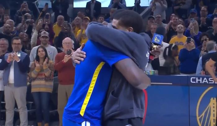 小佩顿首次重返勇士大通中心,赛前追梦格林拥抱小佩顿并且为他颁发总冠军戒指,老佩顿现场见证属于儿子的荣誉时刻,全场球迷为小佩顿鼓掌欢呼,库里、科尔等人都为小佩顿而开心鼓掌,满脸笑容乐开怀;小佩顿挥手向球迷致意。