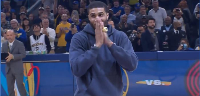 小佩顿正式领取冠军戒指:库里科尔开怀大笑 全场为他欢呼鼓掌