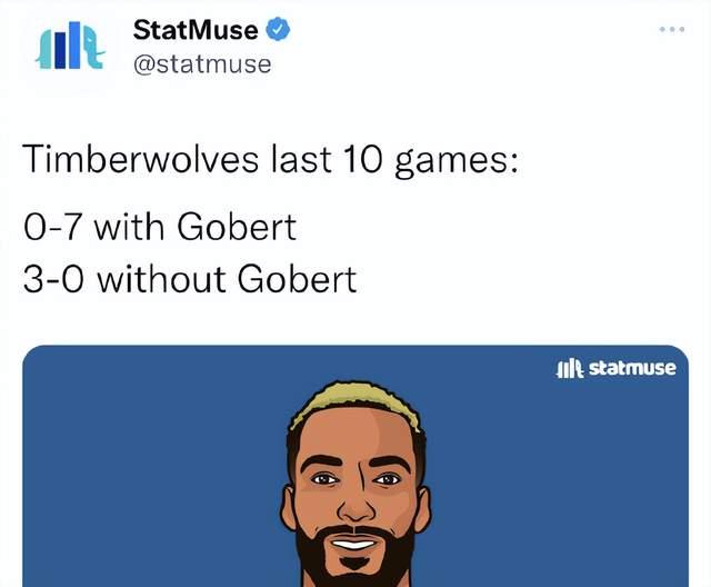 除了两名球员的个人数据有下滑之外,森林狼球队的战绩,也只有16胜19负,仅排名西部第11位。尤其面对强队时,森林狼的表现更是糟糕,几乎没有还手之力。更为尴尬的是,在过去10场森林狼的比赛中,戈贝尔登场时,森林狼0胜7负;而只要戈贝尔不登场,森林狼取得了3胜0负的全胜战绩。