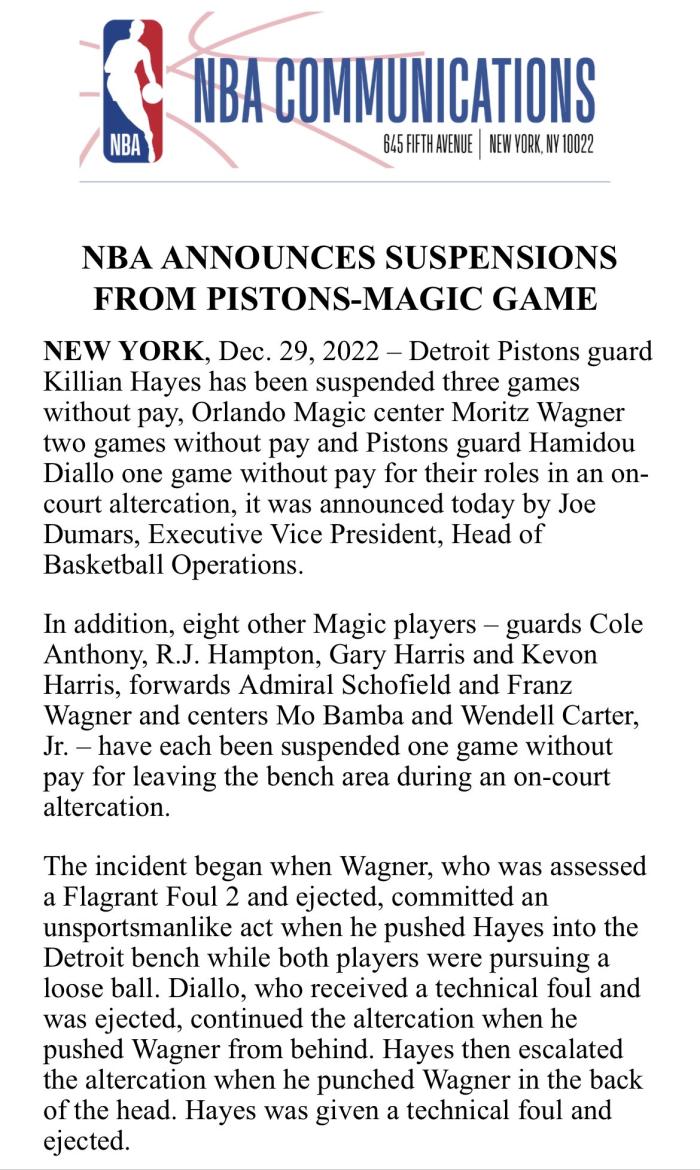 来源:JRS直播网12-30 15:06JRS直播网12月30日讯 ,NBA官方正式公布魔术和活塞火爆冲突的处罚结果,累计11名球员被禁赛,其中海耶斯禁赛3场,瓦格纳禁赛2场。