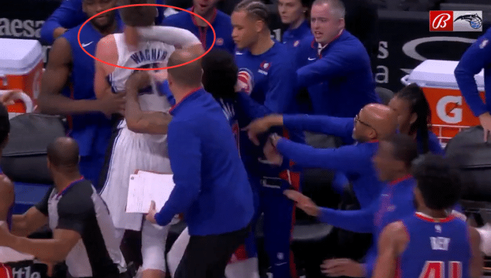 在此前魔术和活塞比赛中,第二节还剩30多秒,海耶斯救球时被大莫瓦格纳阴招推倒,迪亚洛冲过来从背后推搡大瓦格纳,海耶斯站起来后,一记重拳打到瓦格纳的后脑勺,冲突发生在活塞替补席,活塞球员蜂拥而至险些引发围殴,现场十分混乱,班凯罗等魔术球员也冲过来拉架,之后他们被拉开,瓦格纳捂着后脑勺十分痛苦。