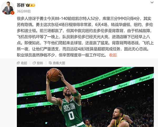 名嘴苏群解读勇士的溃败和库里的低迷,称另有隐情,勇士连续客场作战,6天4场比赛,转战华盛顿、纽约、多伦多和波士顿,在击败尼克斯之后奔赴多伦多,由于机械故障,飞机在停机坪等了一晚上,队员到多伦多已经天光大亮,进酒店睡下已经早上八点,晚上依旧背靠背击败猛龙。如今来到波士顿迎战联盟第一的凯尔特人,严重透支下输球。同时苏群还表示远征4战3胜算是超额完成任务,毕竟这期间太辛苦。