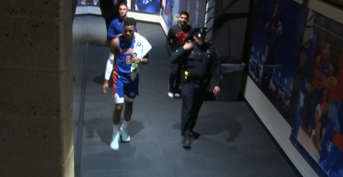 第二节还剩30多秒,海耶斯救球时被大莫瓦格纳阴招推倒,迪亚洛冲过来从背后推搡大瓦格纳,海耶斯站起来后,一记重拳打到瓦格纳的后脑勺,冲突发生在活塞替补席,活塞球员蜂拥而至险些引发围殴,现场十分混乱,班凯罗等魔术球员也冲过来拉架,之后他们被拉开,瓦格纳捂着后脑勺十分痛苦。