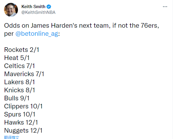 从最新赔率可以看出,若哈登真的离开76人,火箭是他最可能效力的球队,凯尔特人、湖人等队上榜。