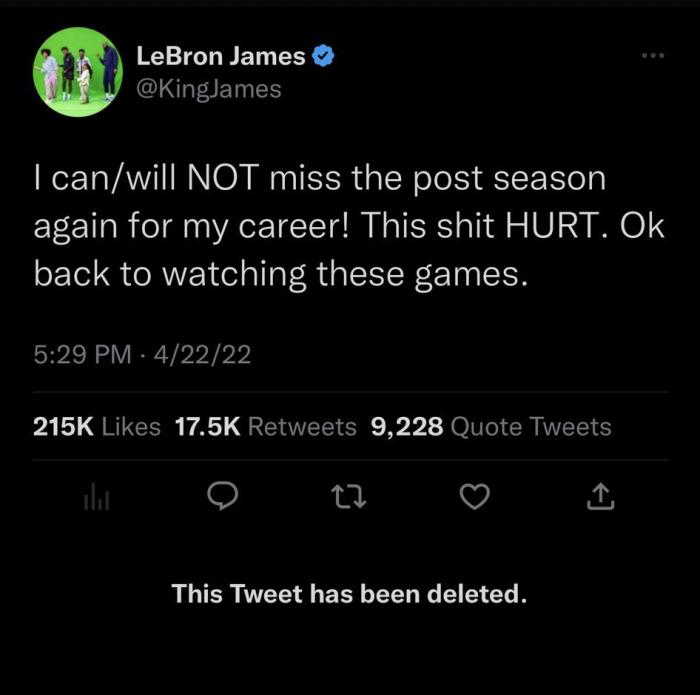 詹姆斯意识到湖人本赛季又要无缘季后赛吗?不久前,詹姆斯晒出8个月前豪言再也不会缺席季后赛的一条推文,今年4月22日,老詹发推写道:我的职业生涯,再也不能、再也不会错过季后赛了!这真的很让人心痛,好了,继续看比赛了。