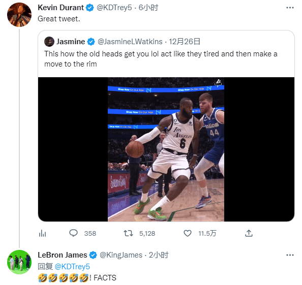 詹姆斯本人回复杜兰特:确实如此(5个笑哭表情)
