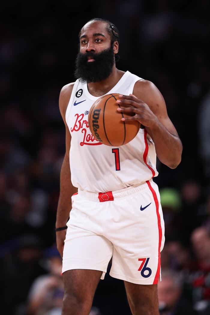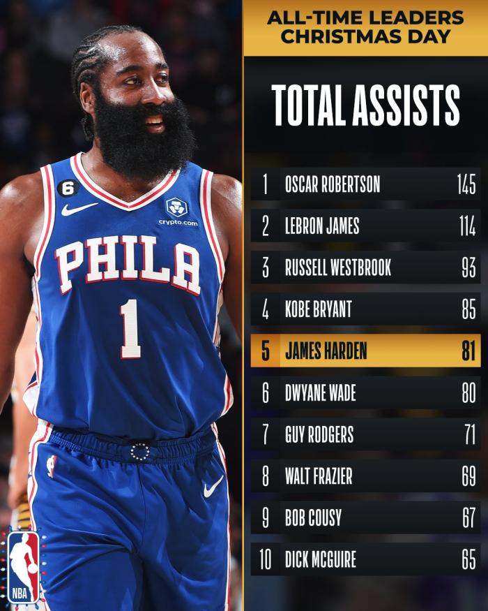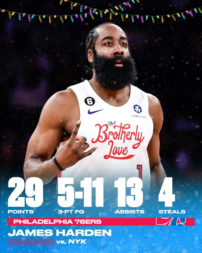 今天哈登投进5记三分拿到29分13助攻,年终大战三分命中数达到31记,超越詹姆斯(28记三分)成为年终大战命中三分最多的球员,也成为76人队史首位在年终大战至少拿到25分10助攻的球员;哈登 年终大战助攻数超越韦德,升到历史第5位。