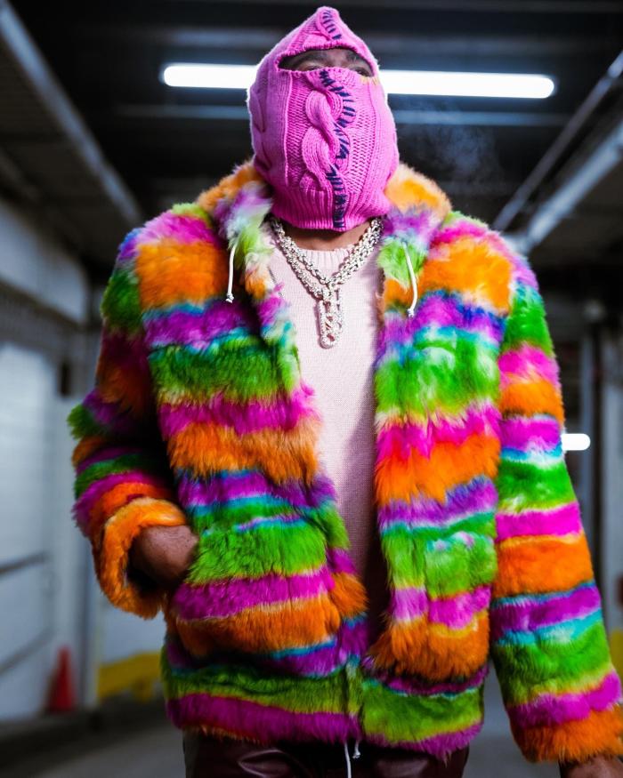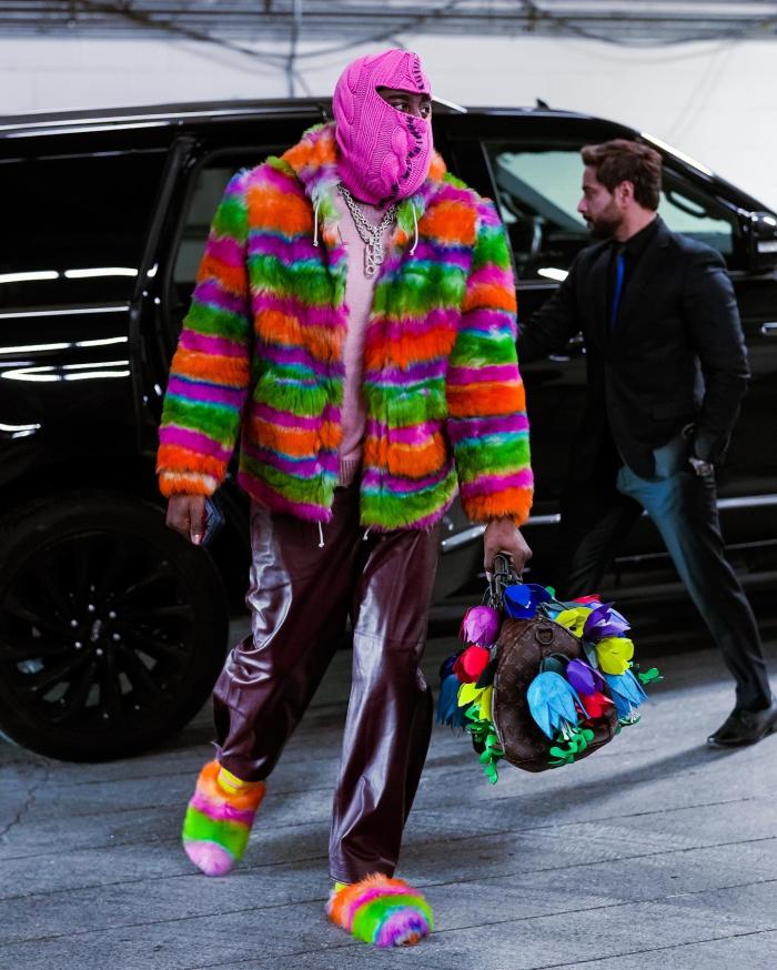 哈登身穿圣诞配色的皮草、黑色皮裤和毛茸茸的鞋子,戴着一顶超大号针织帽,遮住面部仅仅只露出两只眼睛;哈登收拾包包时,手里拿着一叠美金,可能是和好友一起去享受节日吧。