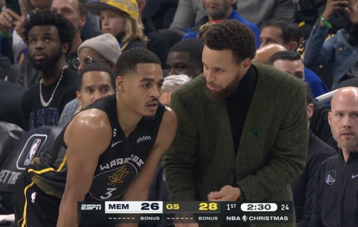 来源:JRS直播网12-26 11:20JRS直播网12月26日讯 ,NBA年终大战勇士对阵灰熊,库里因左肩半脱位的伤势而缺席比赛,库里身穿便装坐在场边观战,期间库里化身库指导,勇士领袖指导普尔一幕引热议。