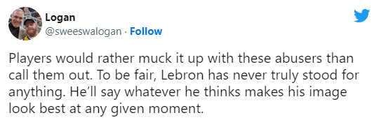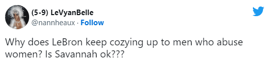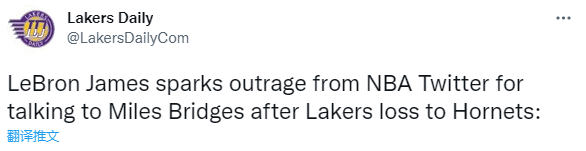 在湖人主场130-134惜败黄蜂赛后,镜头拍到詹姆斯和布里奇斯寒暄,两人有说有笑,如此一幕在推特上引众怒,有球迷讽刺詹姆斯和犯有家暴罪的布里奇斯有说有笑,他真是个好人;还有人质问为什么詹姆斯要和家暴男混在一起?