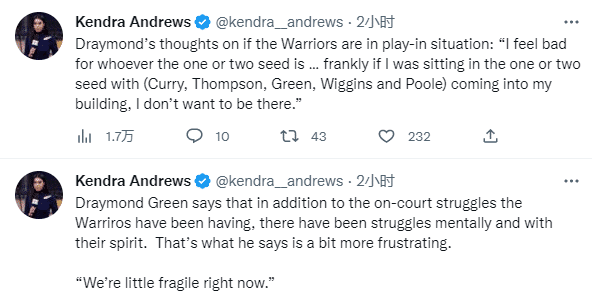 谈到球队现在挣扎表现,追梦表示:“我们除了在场上的困境,还遭遇了一种精神和心理层面上的挣扎,我们现在有点脆弱。