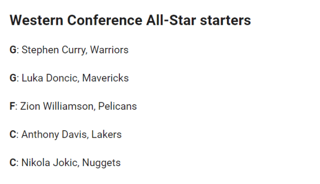 先来看看Sportingnews认为最值得入选西部全明星首发的五位球星。后场两人是勇士的库里和独行侠的东契奇,前场三人是鹈鹕的锡安,湖人的浓眉和掘金的约基奇。