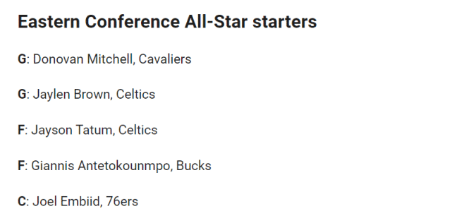 再来看看Sportingnews认为最值得入选东部全明星首发的五位球星。后场两人是骑士的米切尔和凯尔特人的布朗,前场三人是凯尔特人的塔图姆、雄鹿的字母哥和76人的恩比德。