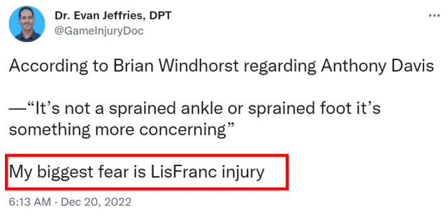 来源:JRS直播网12-20 14:45JRS直播网12月20日讯 了,据名记文霍斯特透露,浓眉的右脚或者右脚踝并非扭伤,这是更令人担心的地方。医学专家Jeffries很快转发并点评:“我最担心的是他遭遇了跖跗关节伤病。”