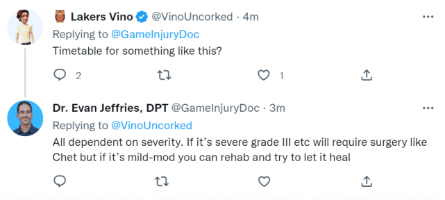 有球迷询问Jeffries有没有具体的康复时间表,Jeffries的回应是:“一切取决于严重程度,如果是严重的三级伤病,那就需要像切特(霍姆格伦)那样接受手术,如果只是轻度的,就可以尝试让它自己愈合。”