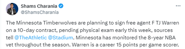 来源:JRS直播网03-03 11:50JRS直播网03月02日,据名记Shams Charania报道,森林狼队计划与自由球员TJ-沃伦签下一份10天短合同,正在等待本周的体检结果,森林狼整个赛季都在关注这位拥有8年NBA经验的老将;沃伦曾单场狂砍53分,生涯场均14.6分,年仅30岁就沦为临时工。