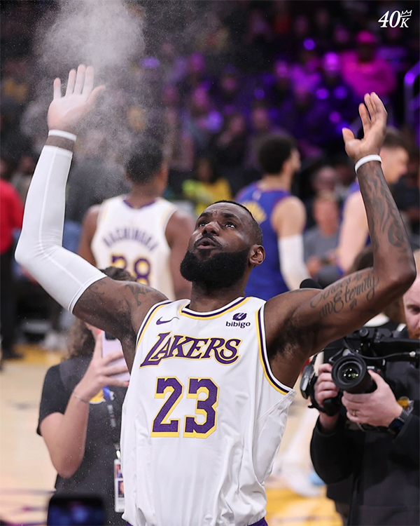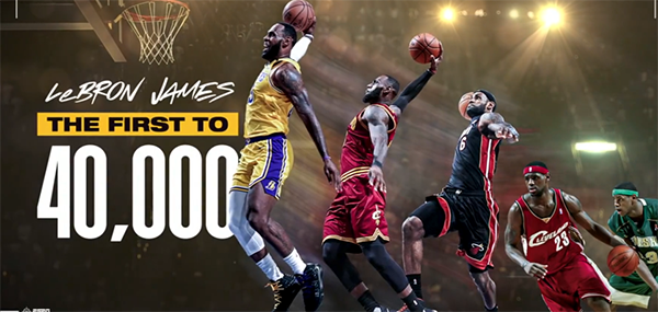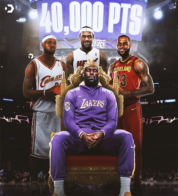 第一节6分20秒,詹姆斯反击上篮得分,随后迎着约基奇命中三分球,3分19秒下场休息,第二节,詹姆斯继续得分,10分40秒,老詹突破上篮,正式达成40000分的历史第一成就,也成为历史上第一位达成411工程(得分4万+助攻1万+篮板1万+)的球员。